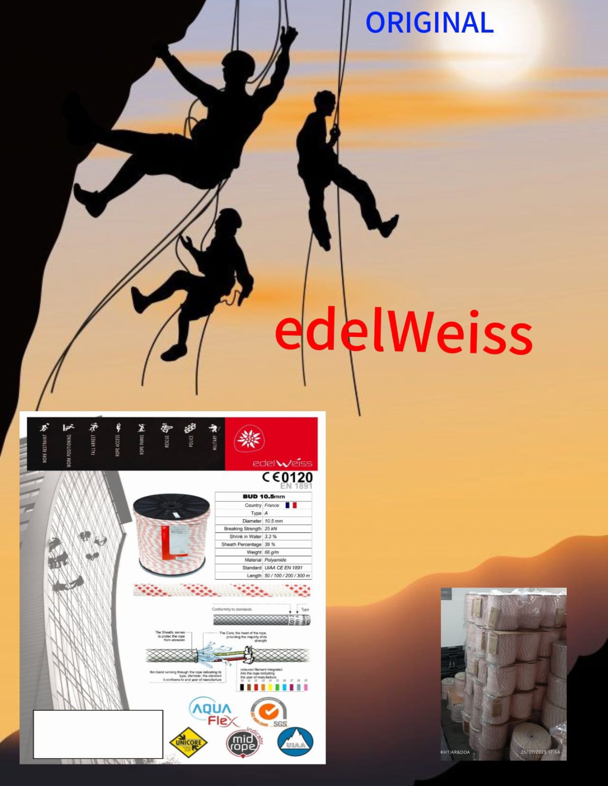 Edelweiss merupakan salah satu merek yang sudah dikenal secara luas dalam industri perlengkapan keselamatan dan peralatan outdoor. Produk-produk Edelweiss dirancang dengan standar kualitas tinggi dan telah digunakan di berbagai negara oleh para profesional yang membutuhkan perlengkapan keselamatan yang dapat diandalkan. Tali karmantel Edelweiss dibuat menggunakan material serat sintetis berkualitas tinggi seperti nylon atau polyamide yang memiliki kekuatan tarik yang sangat baik.